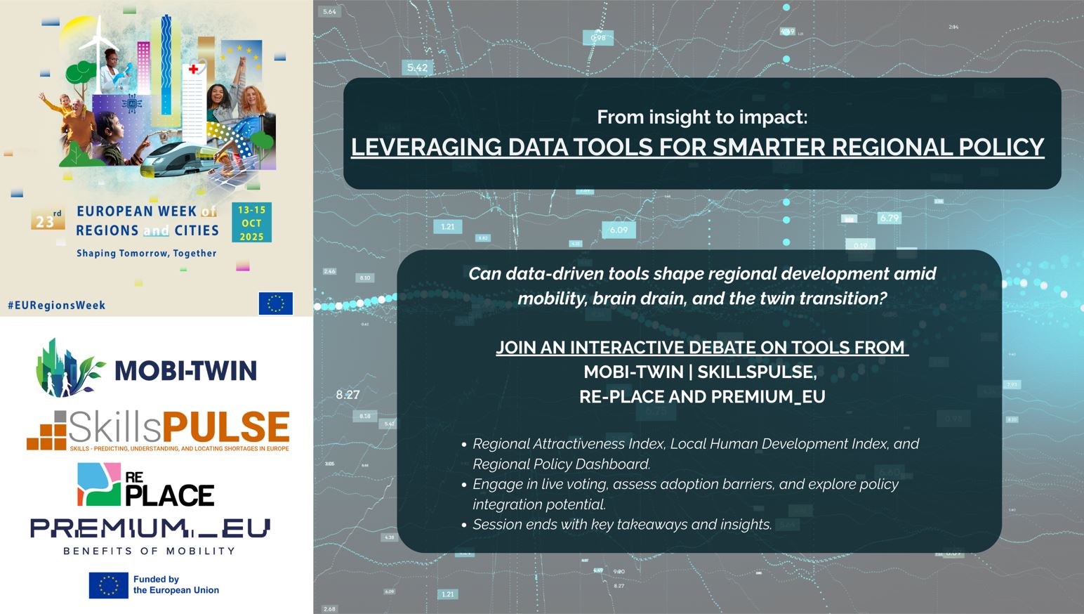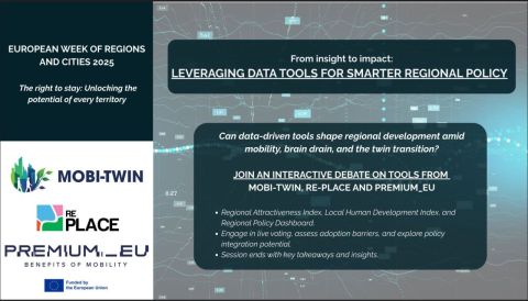 How can diverse data-driven approaches support regional resilience and development in the face of skills shortages, brain drain, and mobility challenges? This interactive session brings together four Horizon Europe projects, MOBI-TWIN, RE-PLACE, PREMIUM_EU and SkillsPULSE, to explore how different methodologies and tools - the Regional Attractiveness Index, the Local Human Development Index, the Regional Policy Dashboard and skills intelligence - can inform better policymaking. Participants will join group discussions at dedicated tables. The session will be closed by a representative of the CoR reflecting on key takeaways and the potential for integration into policymaking.