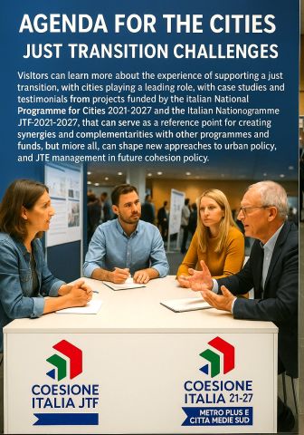 This stand will promote interactive dialogue on the upcoming agenda for cities and on the challenges that cities face ensuring a just transition. Visitors will learn more about how they can support a just transition – and the leading role that cities play in this – through case studies and testimonials from projects funded by the 2021-2027 Italian National Programme for Cities and the 2021-2027 Italian National Programme Just Transition Fund (JTF). These can serve as a reference for creating synergies with other programmes and funds, and shape new approaches to urban policy and JTF management in future cohesion policy.
